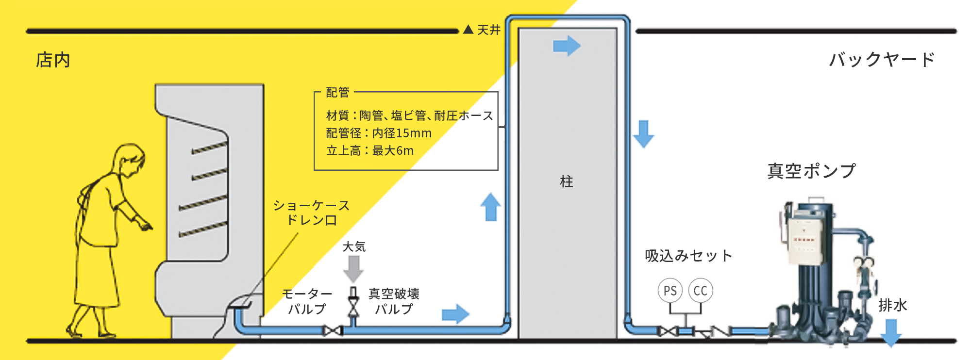 真空の力によって冷ケースのドレン排出配管を