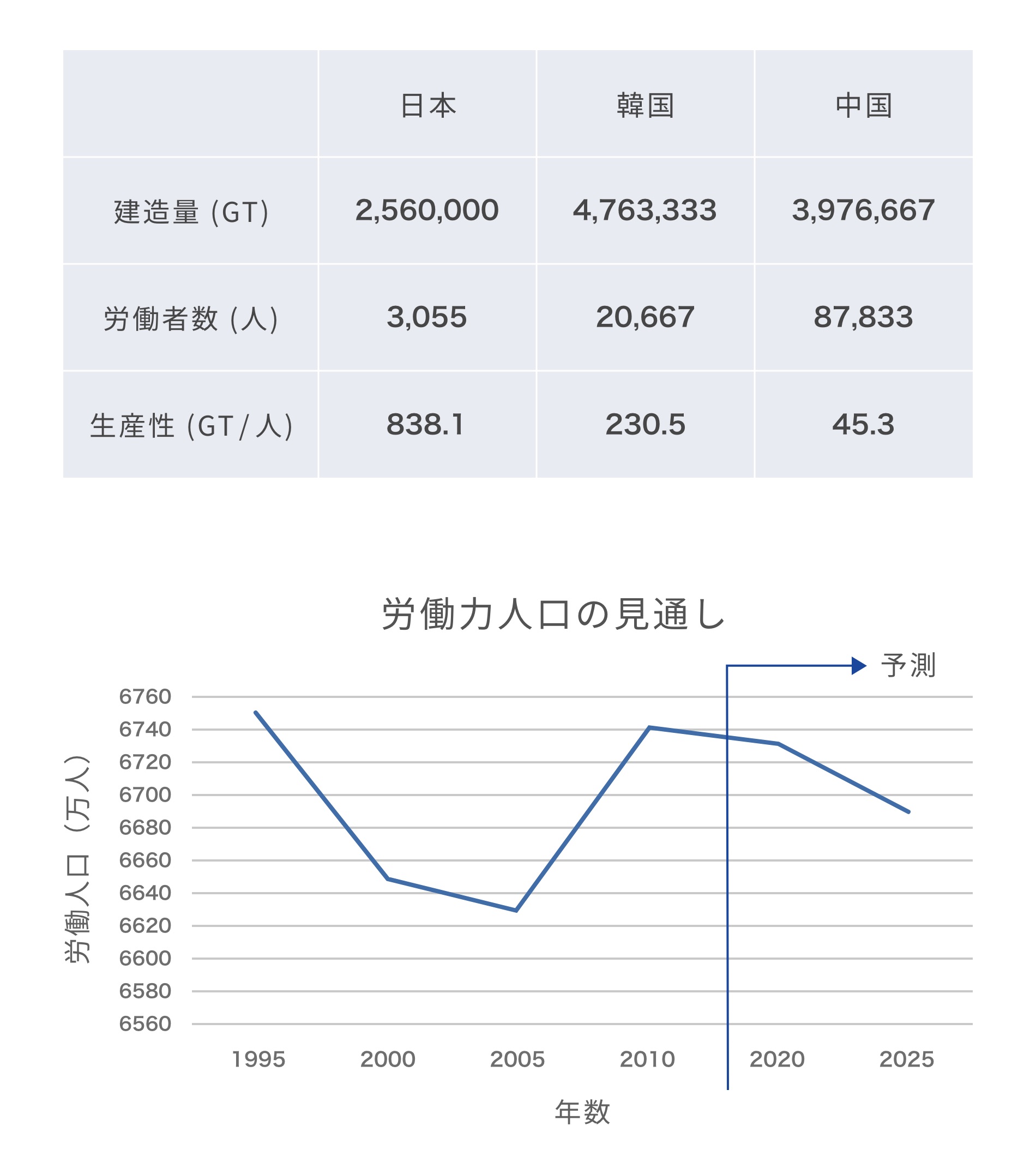 日本造船業は熟練工らによる高い生産性によって競争力を維持しているが、その一方で日本の労働人口は2023年から減少傾向に転じる。